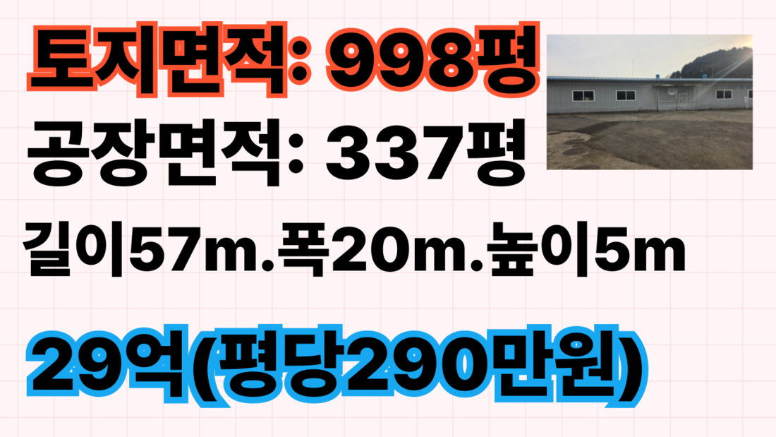◐토지면적 998평. 공장337평 /매매 29억원 (평당290만원)